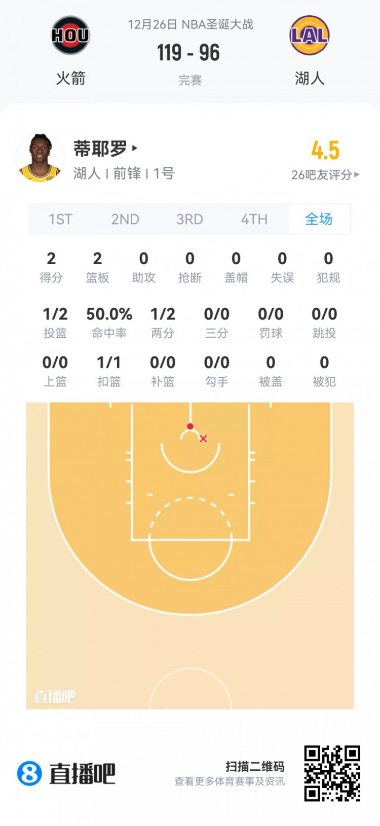 湖人次轮36号秀阿杜·蒂耶罗 登场3.2分钟